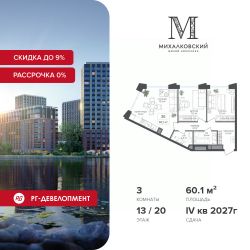 Продаётся 3-к квартира 60,1 кв.м. в ЖК "Михалковский" на 13-м этаже 20 этажного дома.