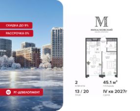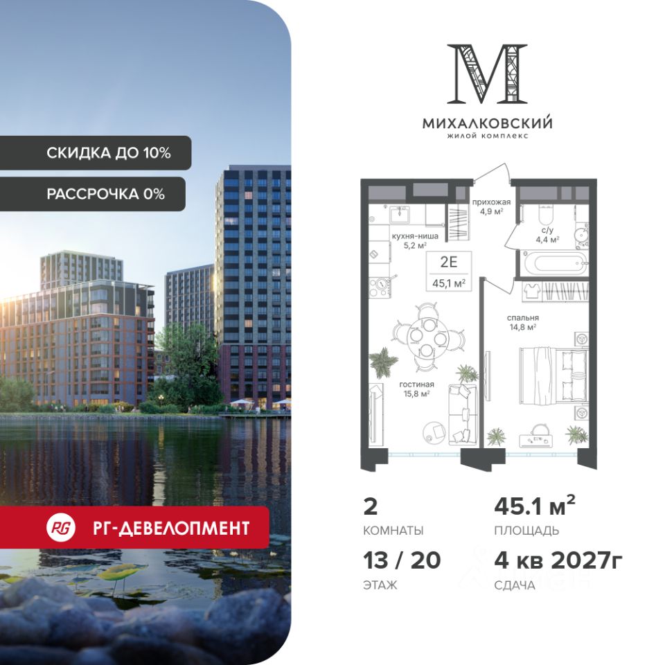 Продаётся 2-к квартира 45,1 кв.м. в ЖК "Михалковский" на 13-м этаже 20 этажного дома.