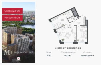 Продаётся 3-к квартира 60,3 кв.м. в ЖК "Михалковский" на 3-м этаже 20 этажного дома.