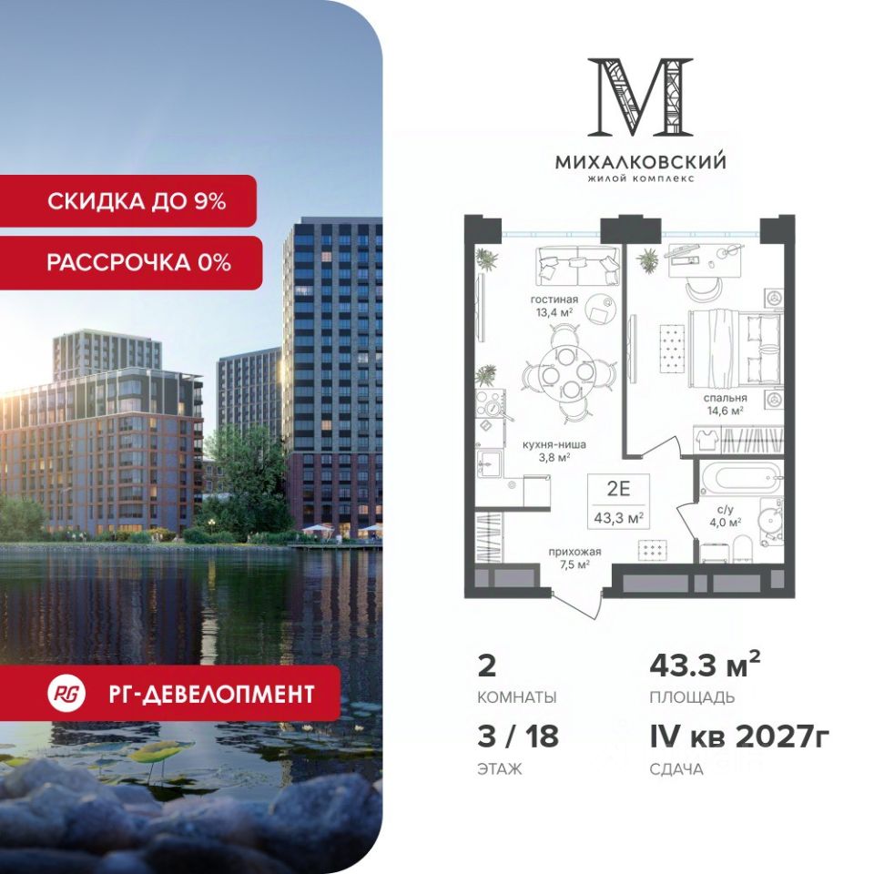 Продаётся 2-к квартира 43,3 кв.м. в ЖК "Михалковский" на 3-м этаже 18 этажного дома.