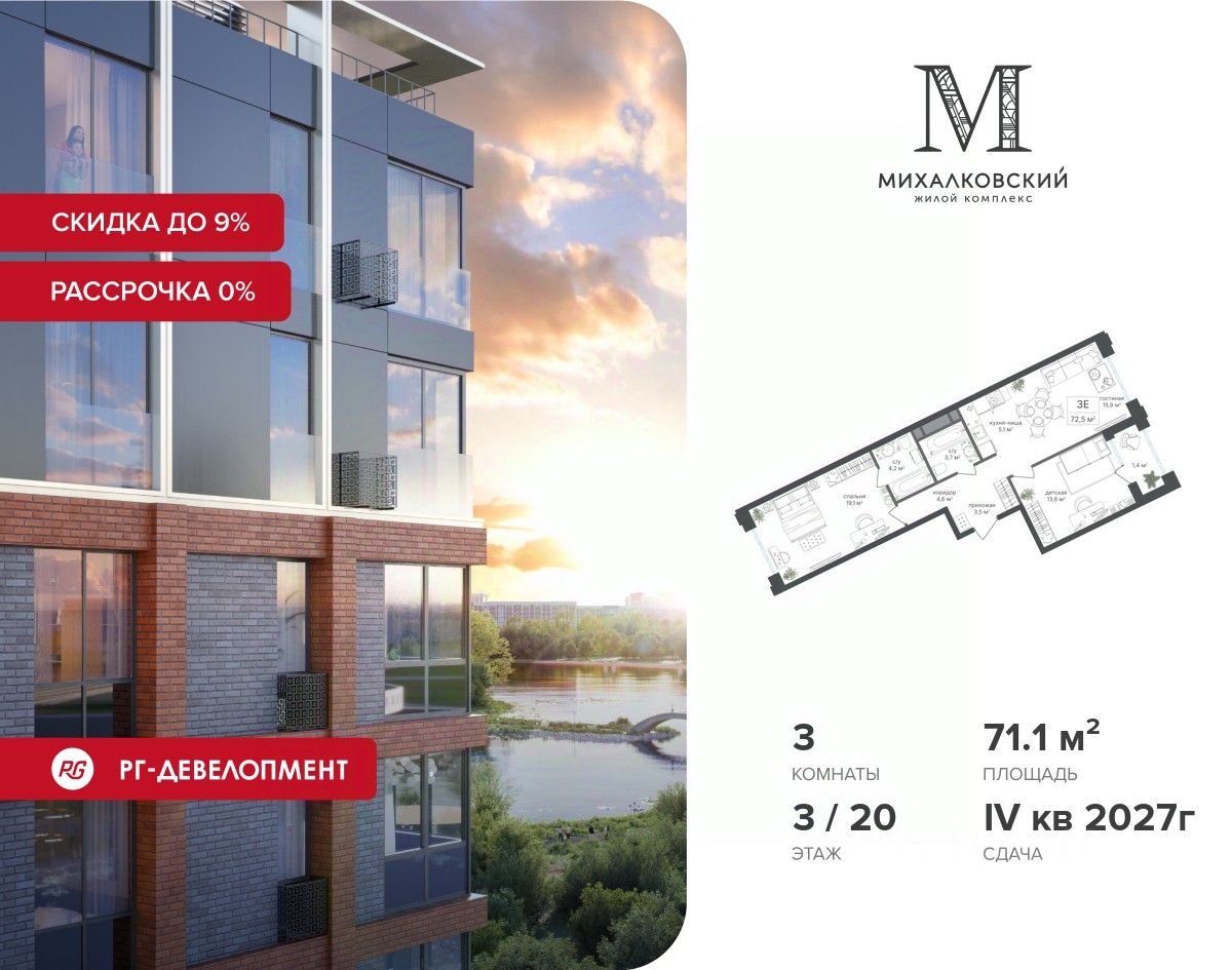 Продаётся 3-к квартира 71,1 кв.м. в ЖК "Михалковский" на 3-м этаже 20 этажного дома.