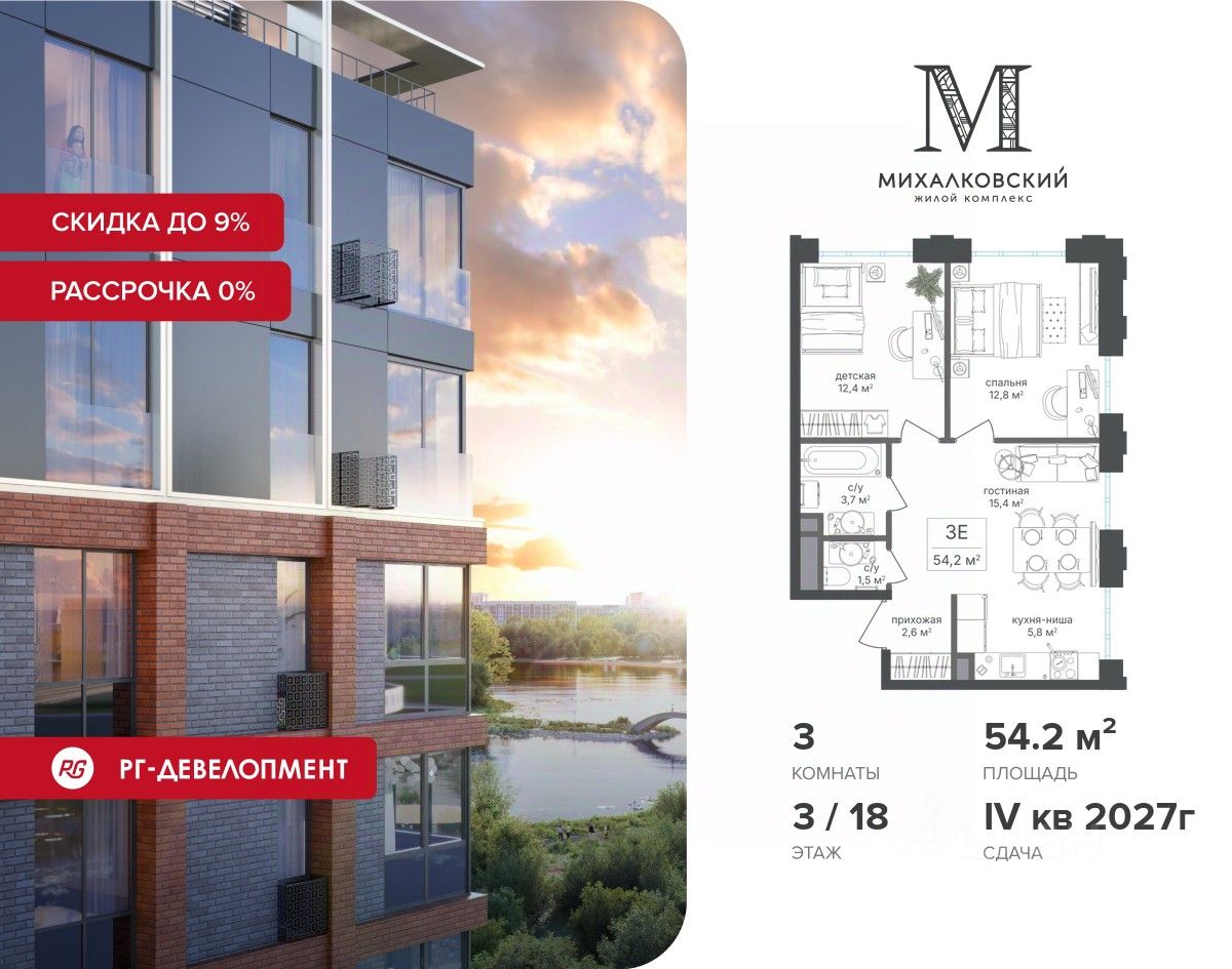 Продаётся 3-к квартира 54,2 кв.м. в ЖК "Михалковский" на 3-м этаже 18 этажного дома.