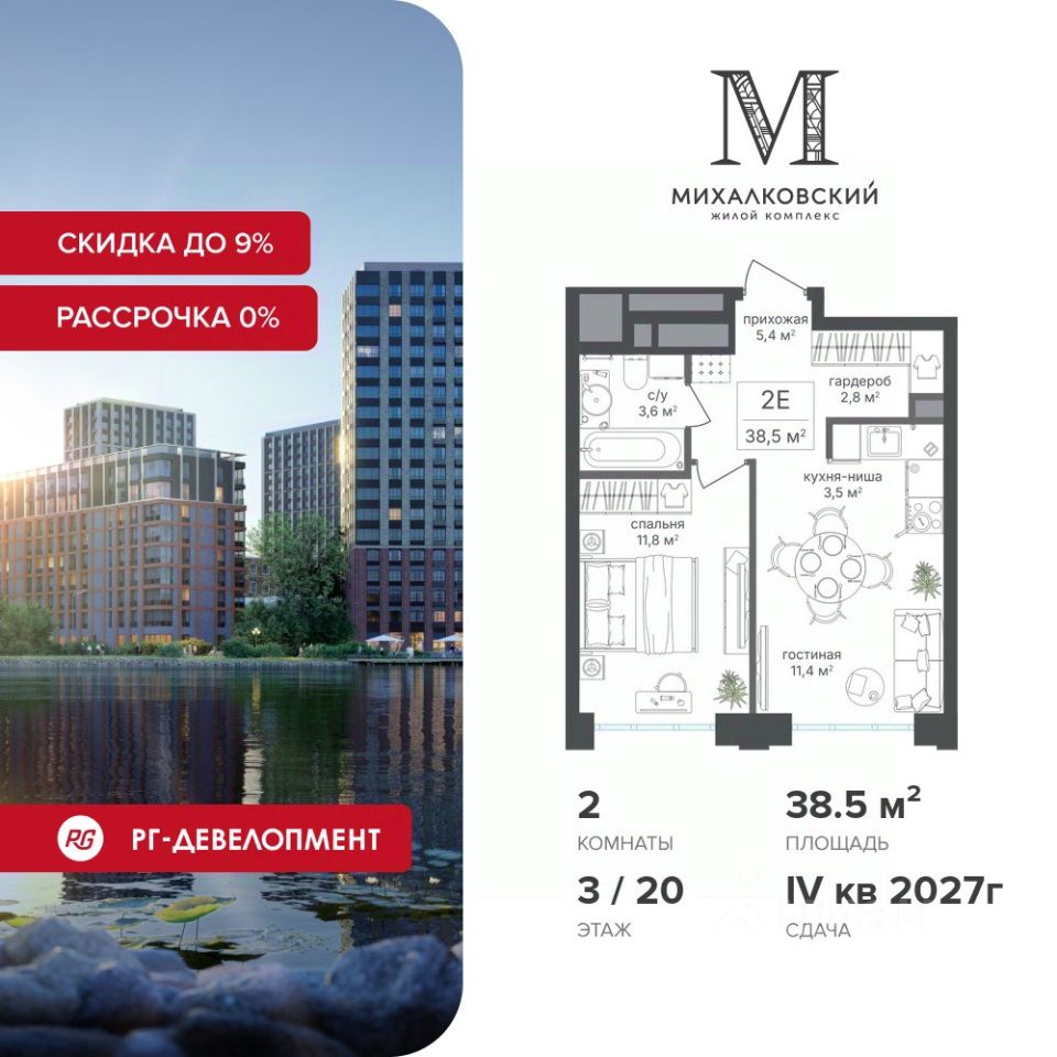 Продаётся 2-к квартира 38,5 кв.м. в ЖК "Михалковский" на 3-м этаже 20 этажного дома.