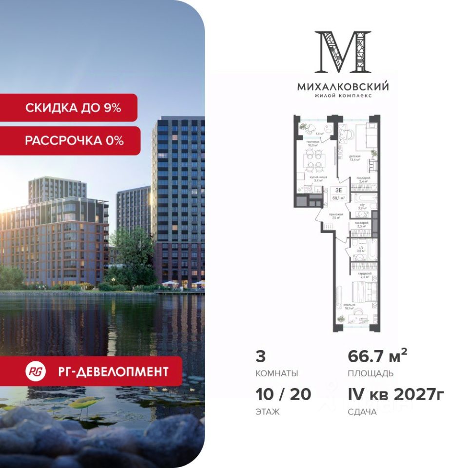 Продаётся 3-к квартира 66,7 кв.м. в ЖК "Михалковский" на 10-м этаже 20 этажного дома.