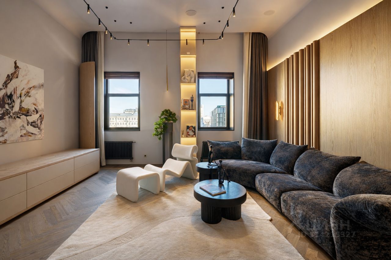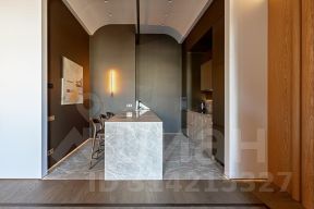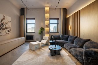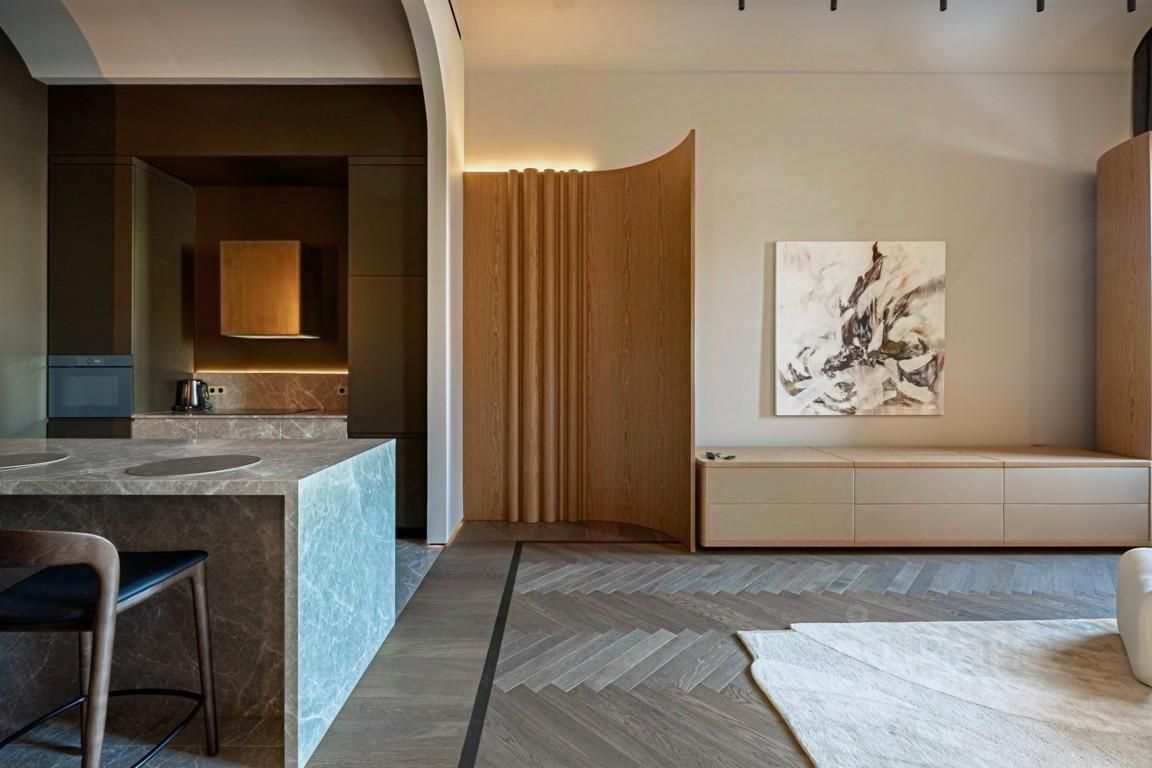 Выполнена премиальная отделка в стиле contemporary minimalism с мягкими арт-деко акцентами: чистые линии, симметрия, высокие потолки и теплая архитектурная подсветка. Установлена итальянская мебель, техника премиум класса (V-ZUG), эксклюзивный свет (люстра Zeppelin и бра Luna).