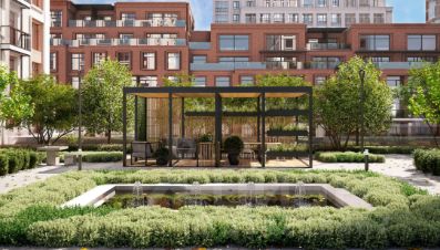 Для жителей первой очереди на крыше торгово-развлекательного центра разместится большой зелёный приватный двор-сад: сосны, канадская ирга, сирень. Будет так же обустроен коворкинг, детская зона с песочницей и место для отдыха с лежаками. Запланирована так же зона с водным объектом и перголами.