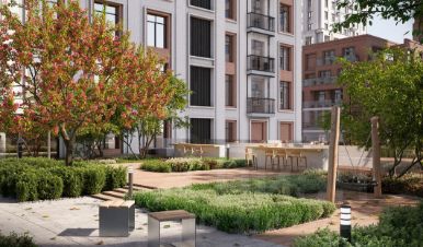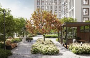 Во дворах будут камерные сады из уже взрослых деревьев и кустарников — тихие и спокойные, в отличие от оживлённых внешних променадов, словно зеленый буфер. Злаковые травы и многолетники, дополнят плотный разноуровневый зелёный каркас, который круглый год будет радовать глаз.