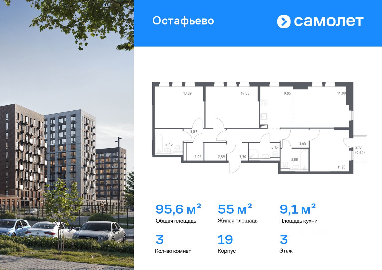 Предлагается 3-комнатная квартира комфорт-класса 95,61 кв.м в корпусе 19 на 3 этаже, в ЖК "Остафьево"