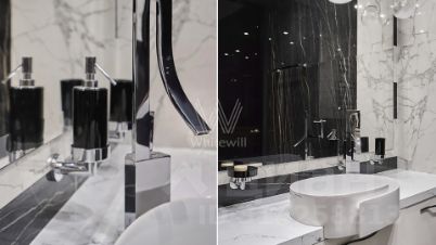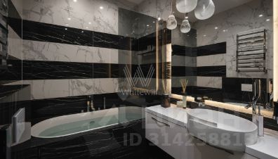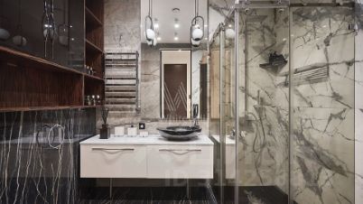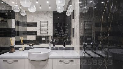 На полу инженерная доска, каменные подоконники, натуральный камень в санузлах.
