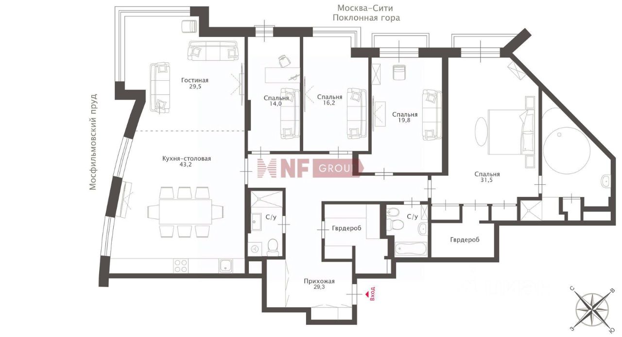 Планировка: гостиная-столовая с зоной кухни, мастер-спальня с ванной комнатой, две спальни с собственными санузлами, кабинет (гостевая спальня), гостевой санузел, гардеробная.