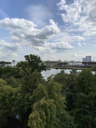 -гостиная с балконом , панорамными окнами с видом на пруд и парк;