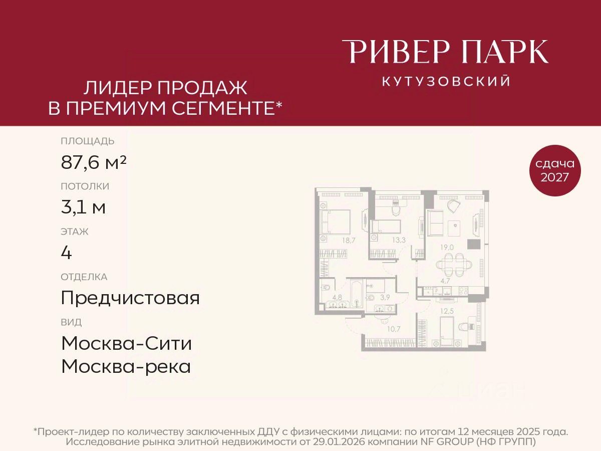 Продается 3-к квартира площадью 87.6 кв.м. на 4-м этаже в жилом комплексе премиум-класса Ривер Парк Кутузовский в Башне Бриллиант