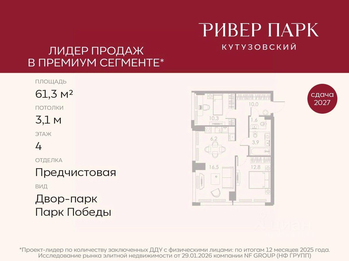 Продается 2-к квартира площадью 61.3 кв.м. на 4-м этаже в жилом комплексе премиум-класса Ривер Парк Кутузовский в Башне Бриллиант