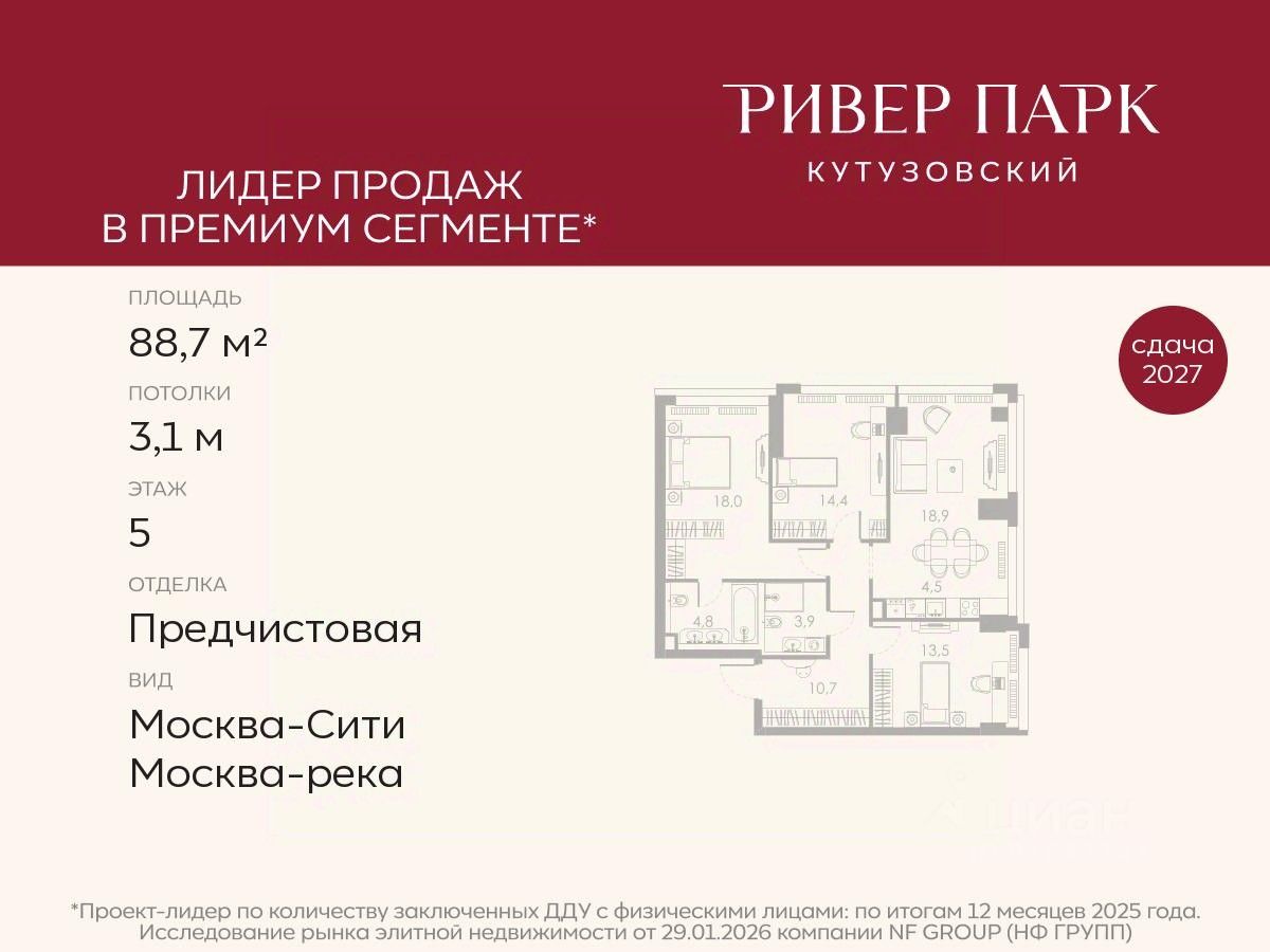 Продается 3-к квартира площадью 88.7 кв.м. на 5-м этаже в жилом комплексе премиум-класса Ривер Парк Кутузовский в Башне Бриллиант
