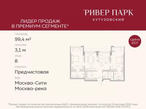 Продается 2-к квартира площадью 99.4 кв.м. на 8-м этаже в жилом комплексе премиум-класса Ривер Парк Кутузовский в Башне Бриллиант