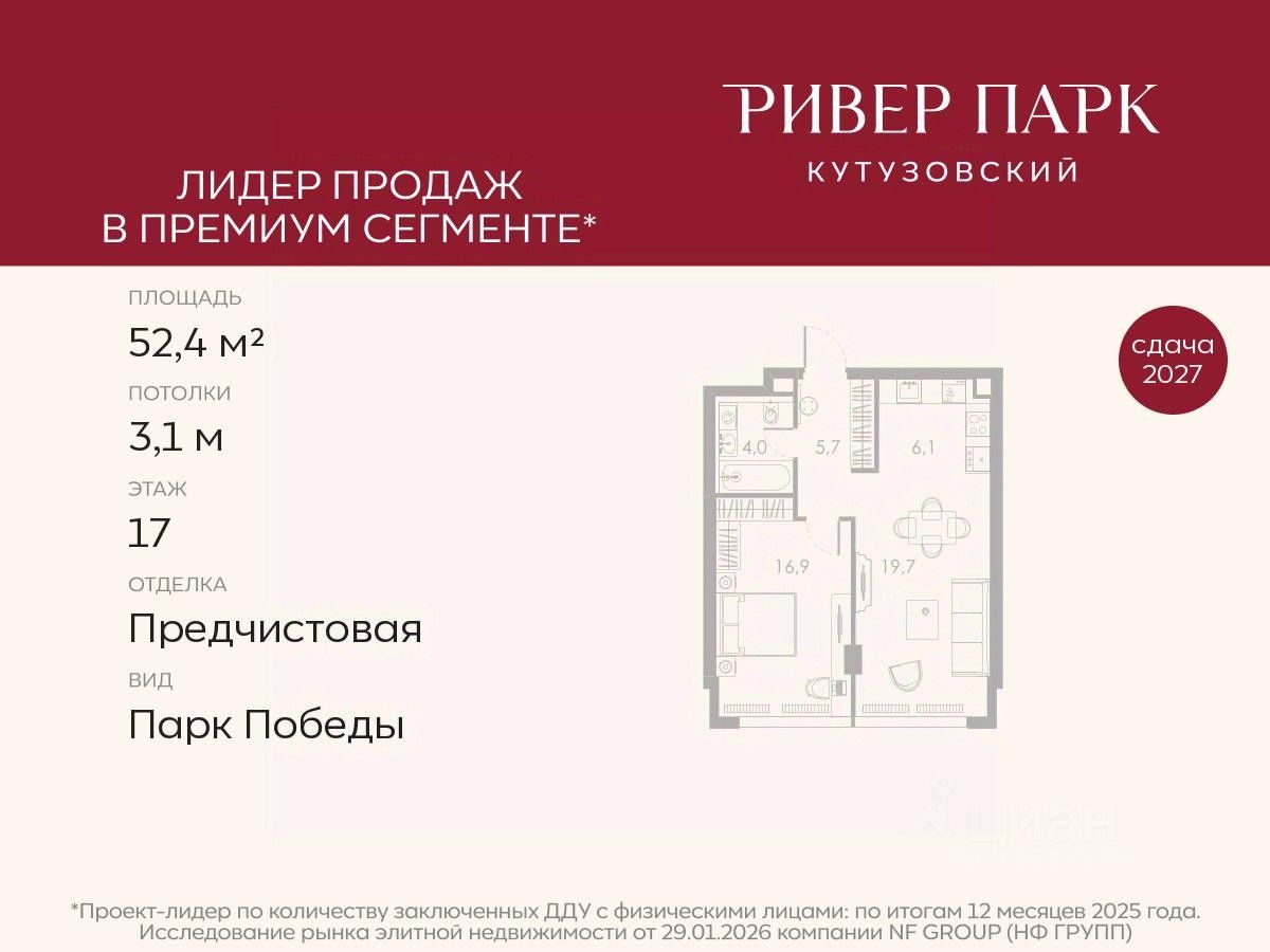 Продается 1-к квартира площадью 52.4 кв.м. на 17-м этаже в жилом комплексе премиум-класса Ривер Парк Кутузовский в Башне Бриллиант