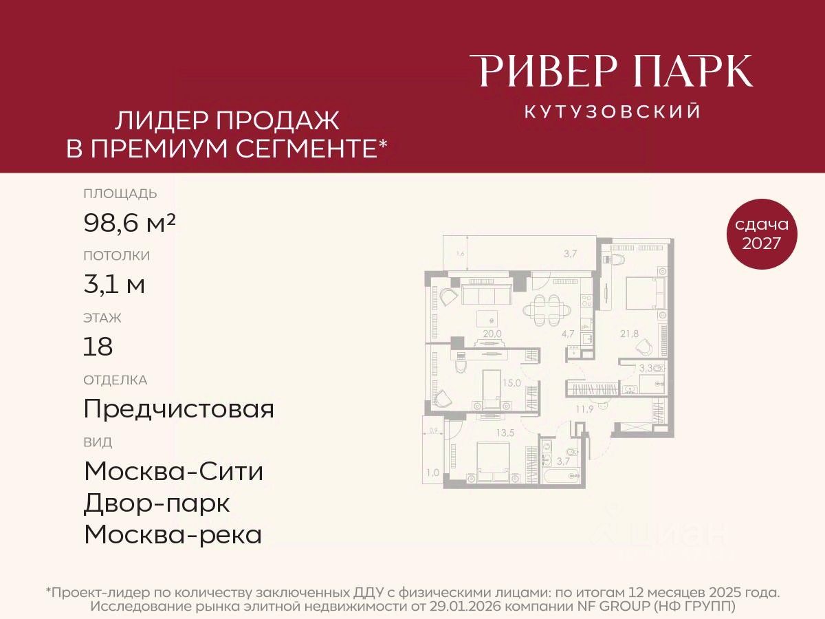 Продается 3-к квартира площадью 98.6 кв.м. на 18-м этаже в жилом комплексе премиум-класса Ривер Парк Кутузовский в Башне Бриллиант