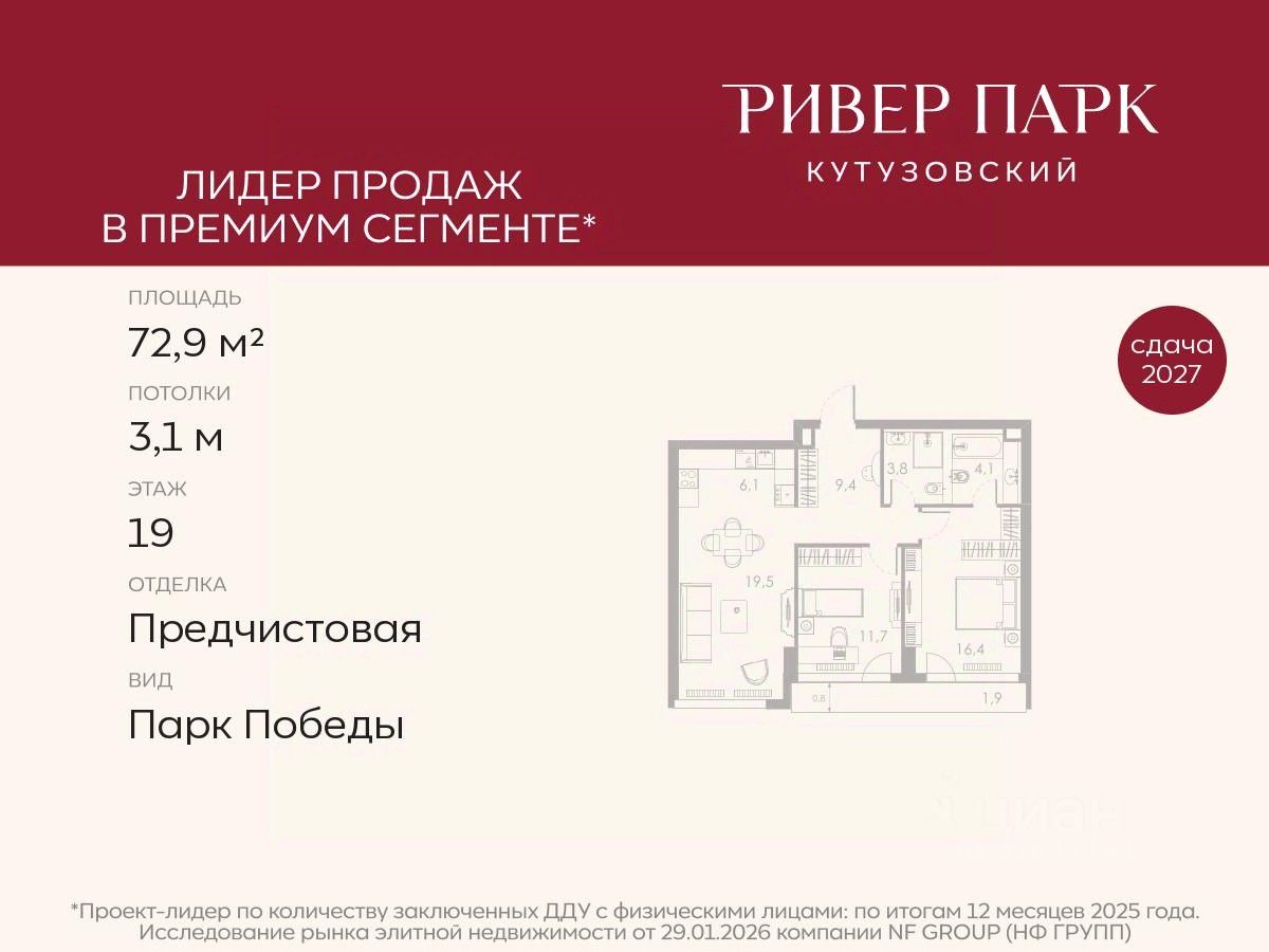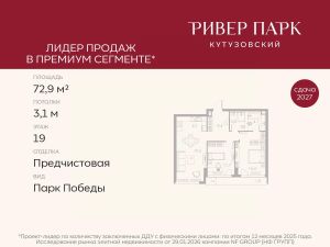 Продается 2-к квартира площадью 72.9 кв.м. на 19-м этаже в жилом комплексе премиум-класса Ривер Парк Кутузовский в Башне Бриллиант