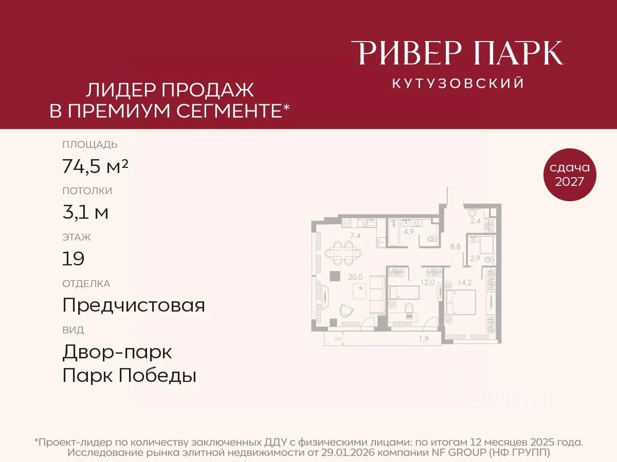 Продается 2-к квартира площадью 74.5 кв.м. на 19-м этаже в жилом комплексе премиум-класса Ривер Парк Кутузовский в Башне Бриллиант