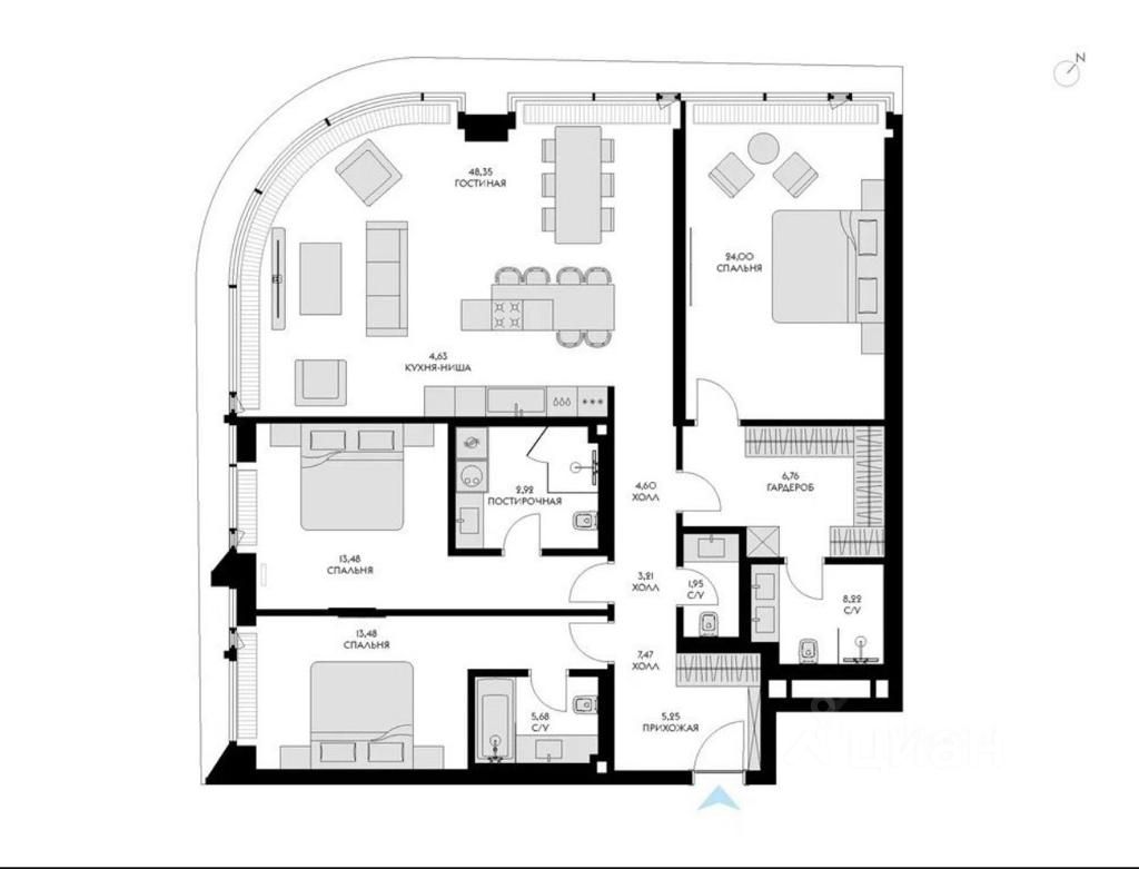 Отделка от застройщика в стиле Неодеко с серым мрамором. Полукруглые окна выполнены фирмой Schuco, система вентиляции приточно-вытяжная.