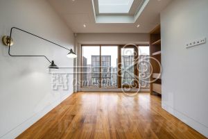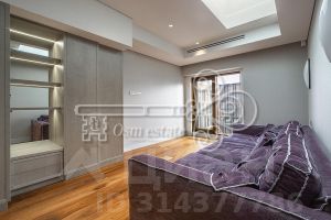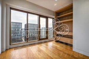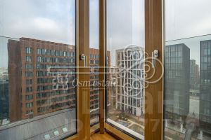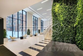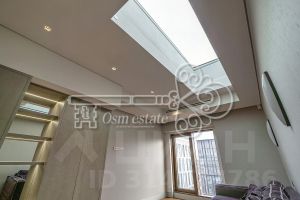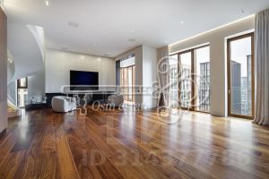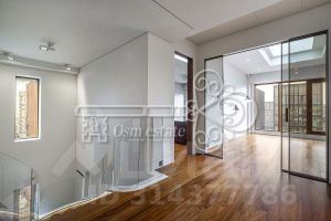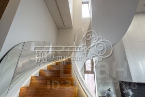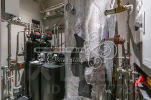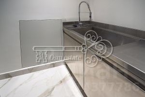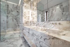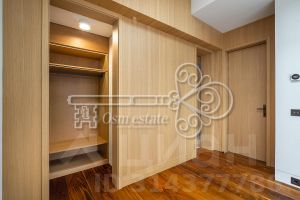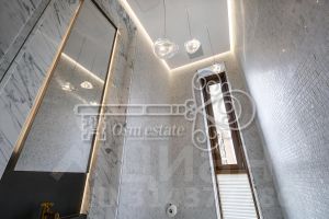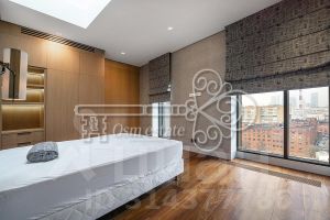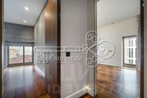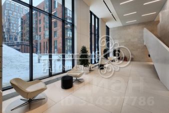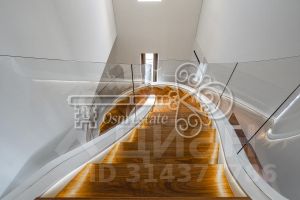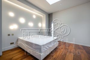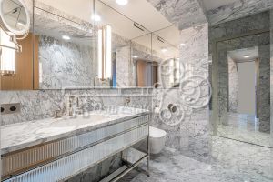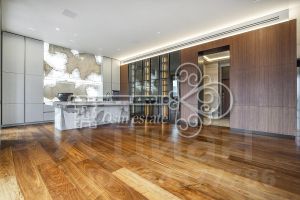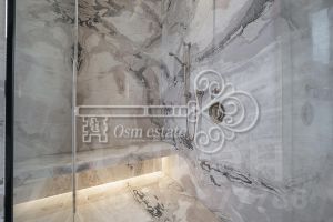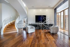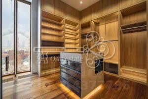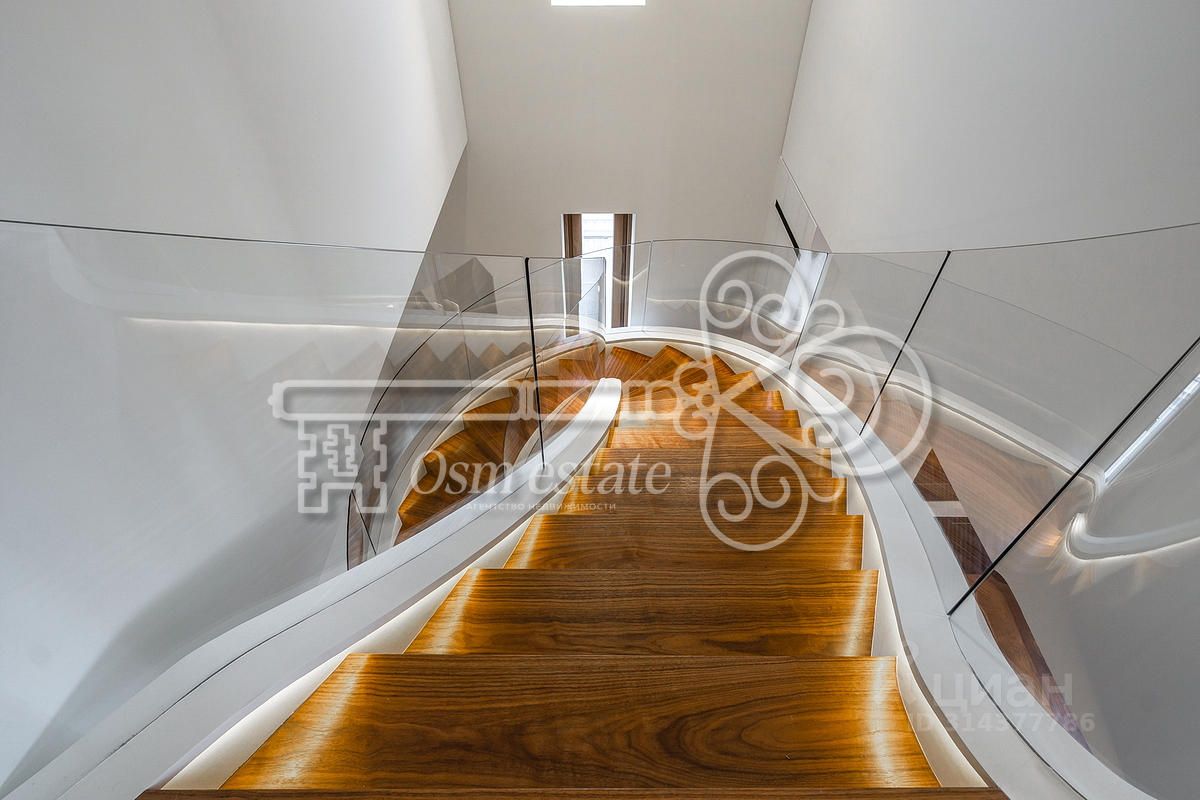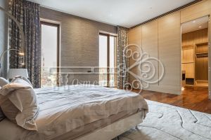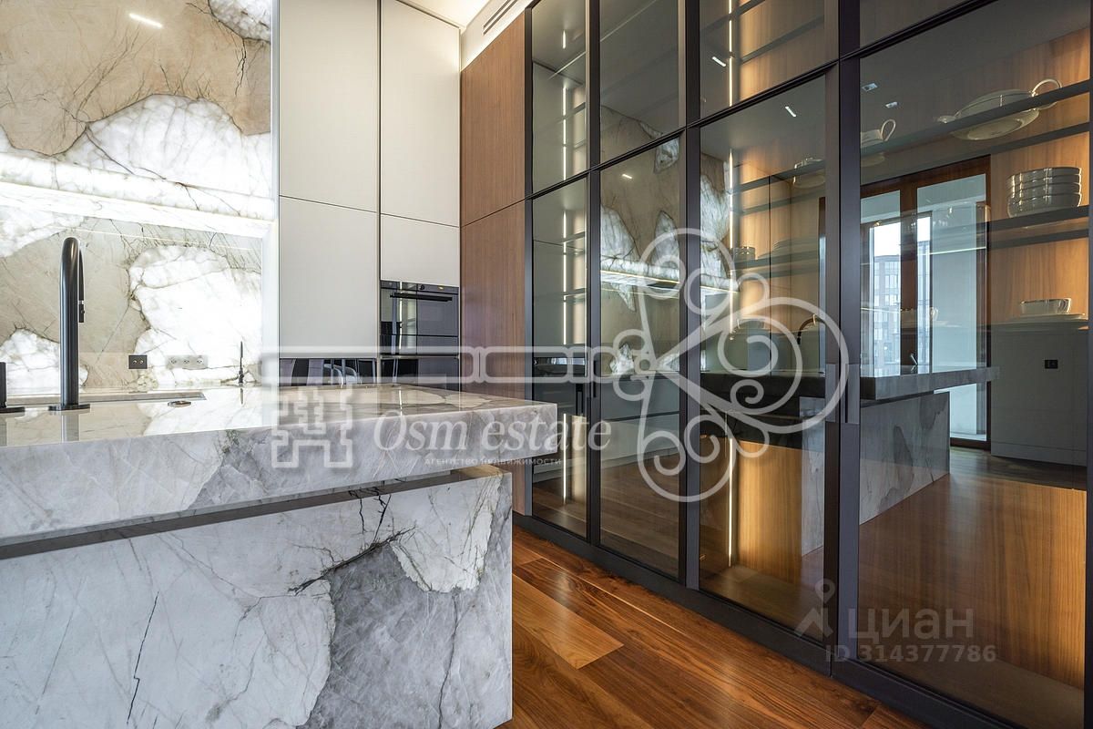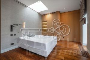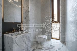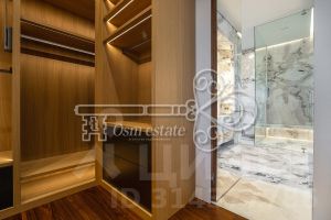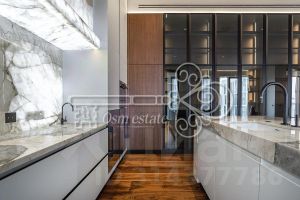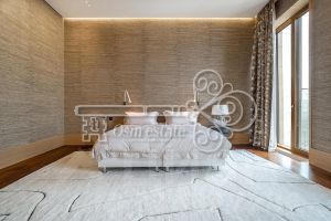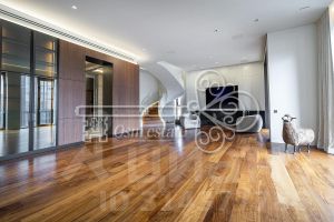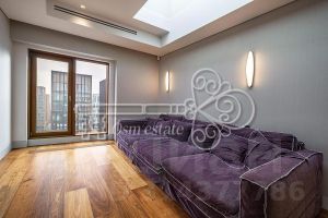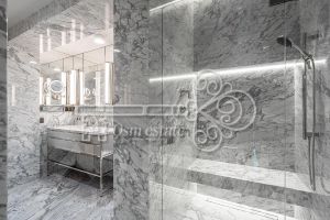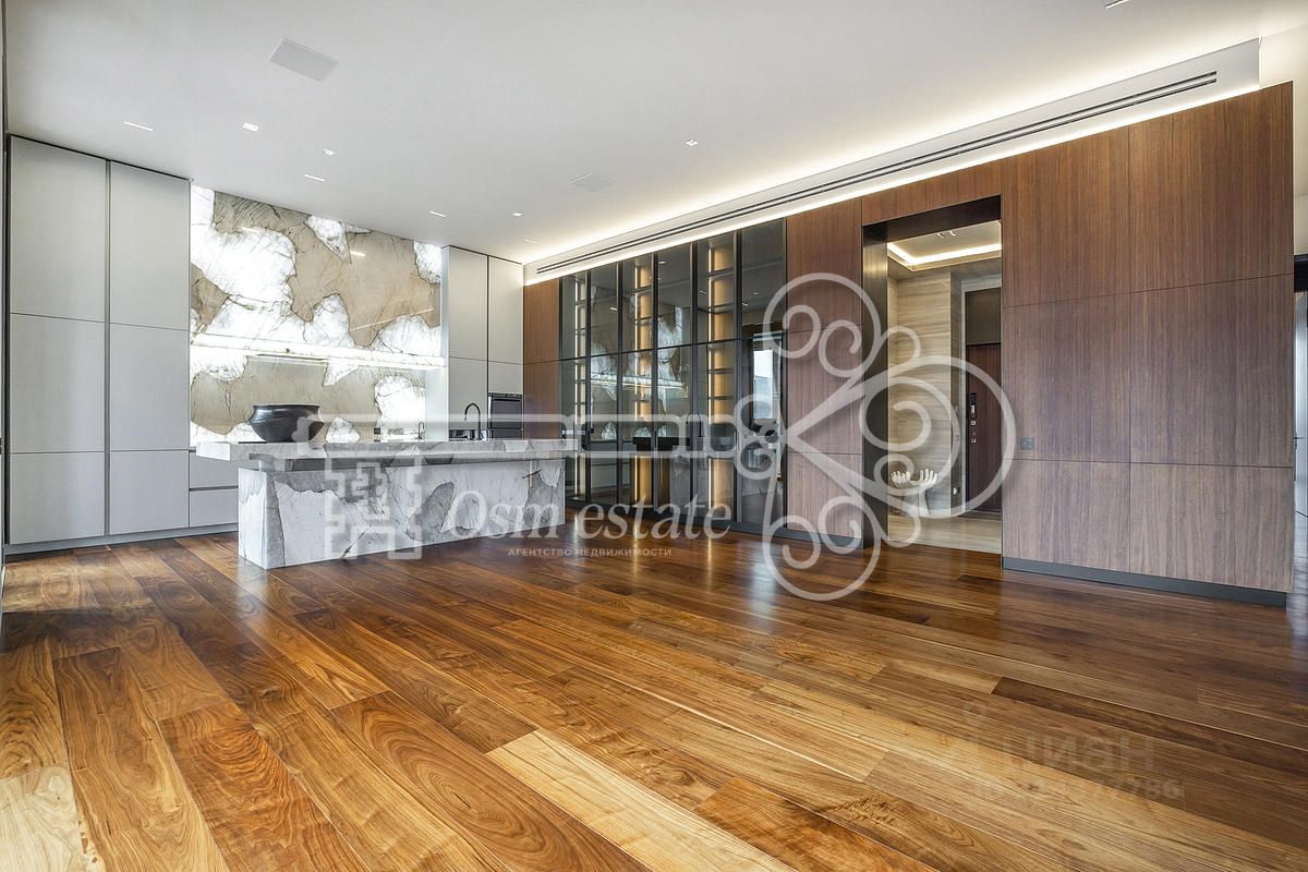 Интерьер выполнен в современном стиле с использованием элитных материалов, таких как ценные породы дерева и натуральный камень. В помещении установлена мебель, бытовая техника и сантехника премиальных брендов.