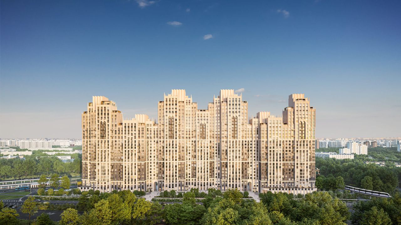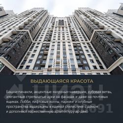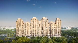 В отделке фасадов используются высококачественные материалы. Градиентная цветовая растяжка от тёмного внизу к светлому наверху создаёт иллюзию растворяющихся в облаках фасадов здания.