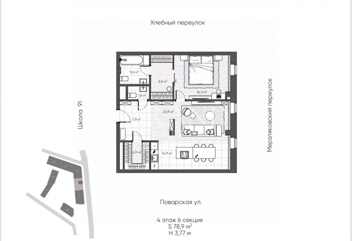 Апартамент общей площадью 78,9 кв.м. с предчистовой отделкой.
