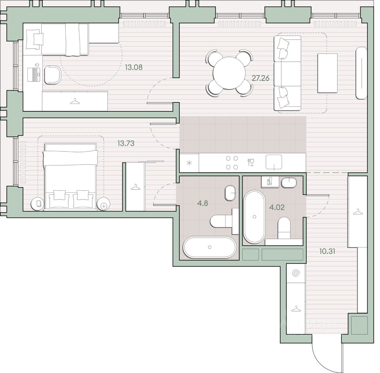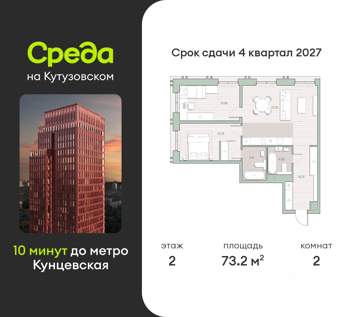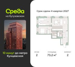 Продаётся 2-комнатная квартира общей площадью 73.2 кв.м. с отделкой white box. Квартира расположена на 2 этаже корпуса 5 в жилом комплексе бизнес-класса "Среда на Кутузовском" в пешей доступности от метро "Кунцевская".