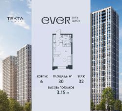 1-комн. квартира в ЖК "Ever" на 32 этаже в 34 этажном здании Корпус 6. Общая площадь: 30 кв.м., жилая: 15.1 кв.м. Высота потолков 3.15 м.