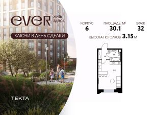 1-комн. квартира в ЖК "Ever" на 32 этаже в 34 этажном здании Корпус 6. Общая площадь: 30.1 кв.м., жилая: 15.1 кв.м. Высота потолков 3.15 м.