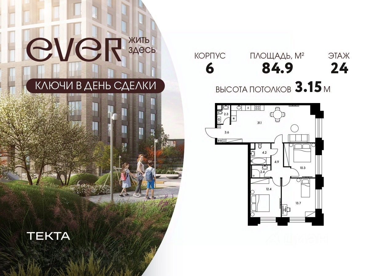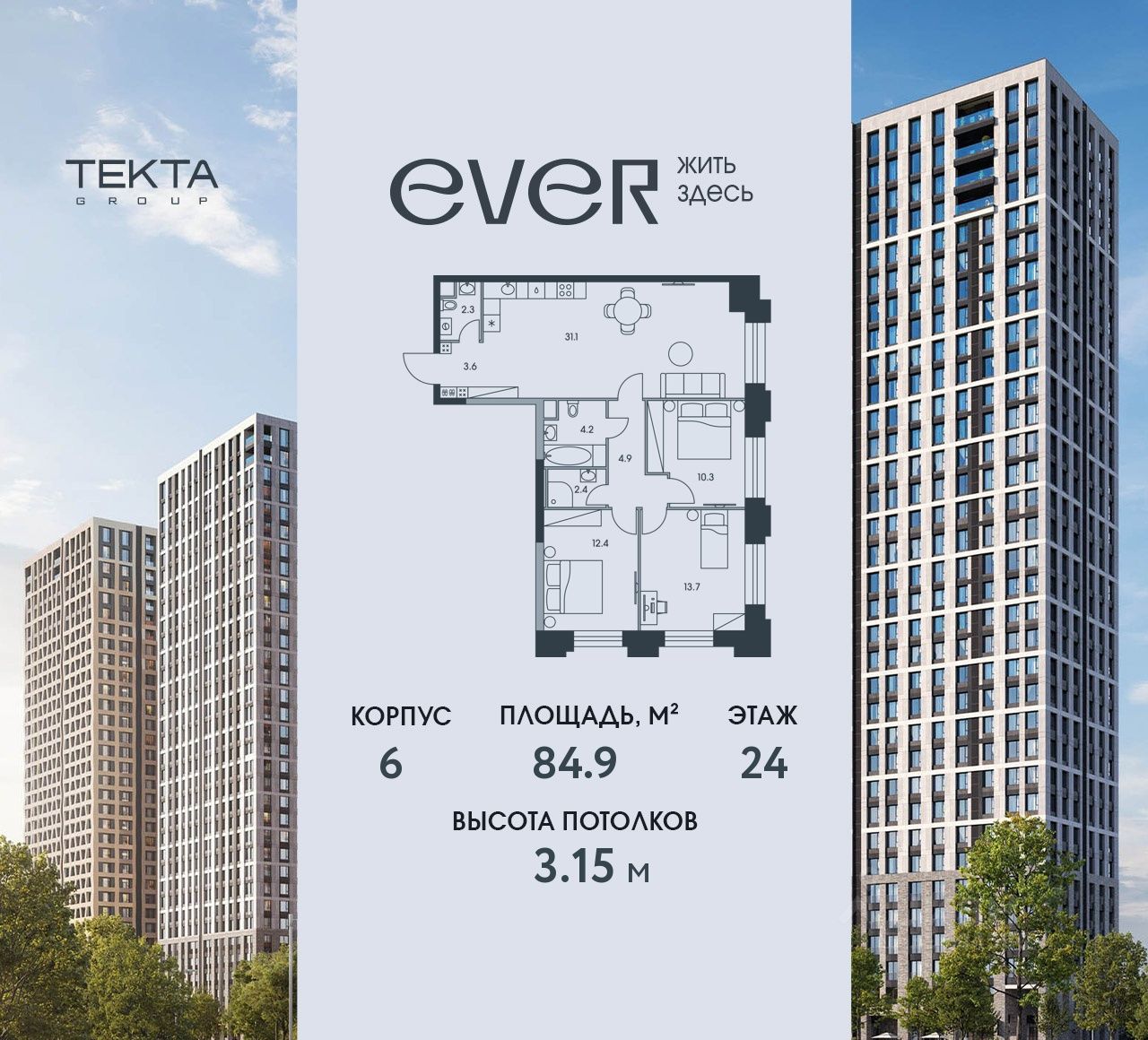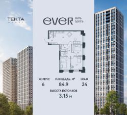 4-комн. квартира в ЖК "Ever" на 24 этаже в 34 этажном здании Корпус 6. Общая площадь: 84.9 кв.м., жилая: 56.4 кв.м. Высота потолков 3.15 м.