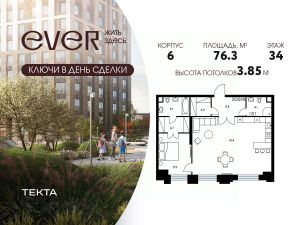 2-комн. квартира в ЖК "Ever" на 34 этаже в 34 этажном здании Корпус 6. Общая площадь: 76.3 кв.м., жилая: 47.2 кв.м. Высота потолков 3.85 м.