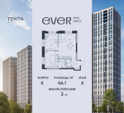 3-комн. квартира в ЖК "Ever" на 6 этаже в 34 этажном здании Корпус 6. Общая площадь: 66.1 кв.м., жилая: 42.6 кв.м. Высота потолков 3.00 м.