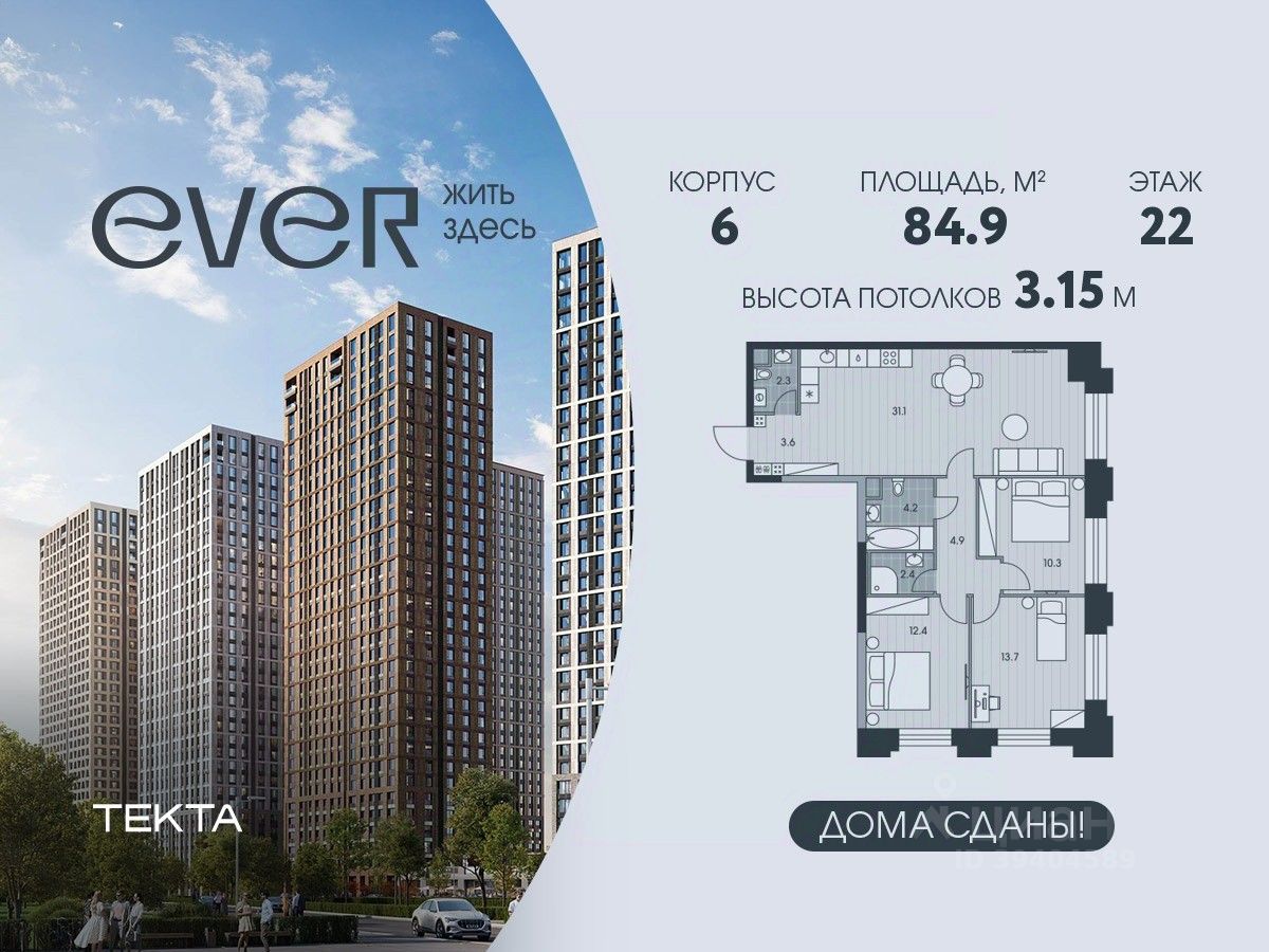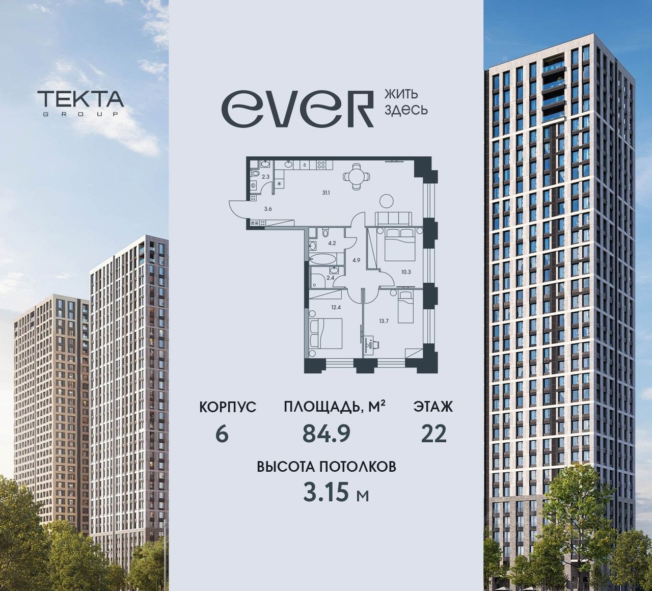 4-комн. квартира в ЖК "Ever" на 22 этаже в 34 этажном здании Корпус 6. Общая площадь: 84.9 кв.м., жилая: 56.4 кв.м. Высота потолков 3.15 м.