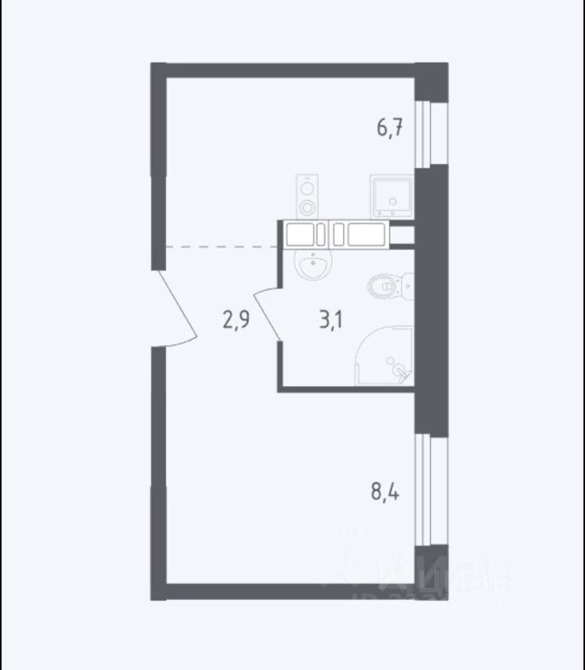 Площадь студии - 21,1 кв.м., совмещенный санузел - 3,1 кв.м.