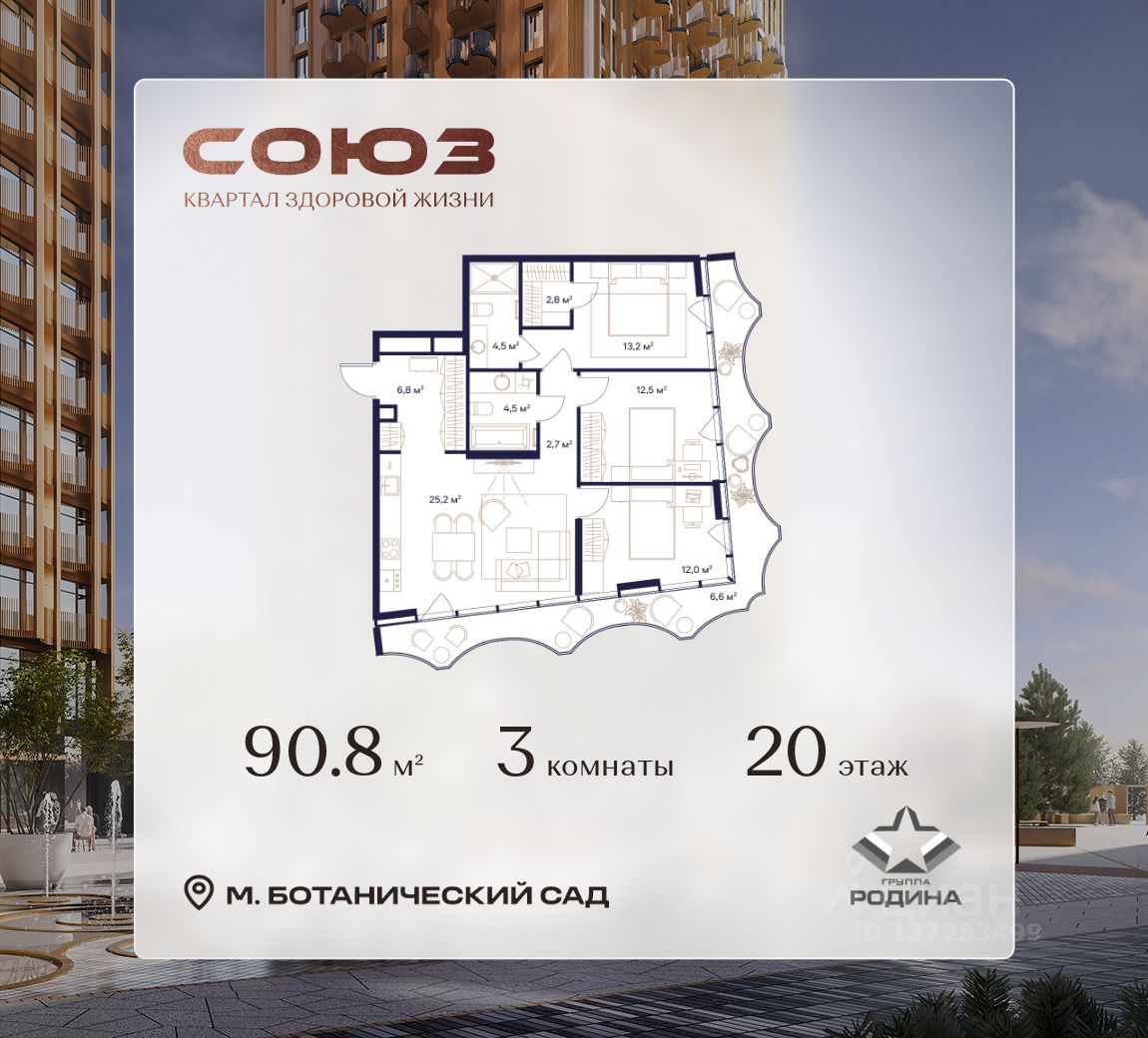 Продаётся 3-комнатная квартира площадью 90.8 м² на 20 этаже в Жилом Комплексе "Союз".
