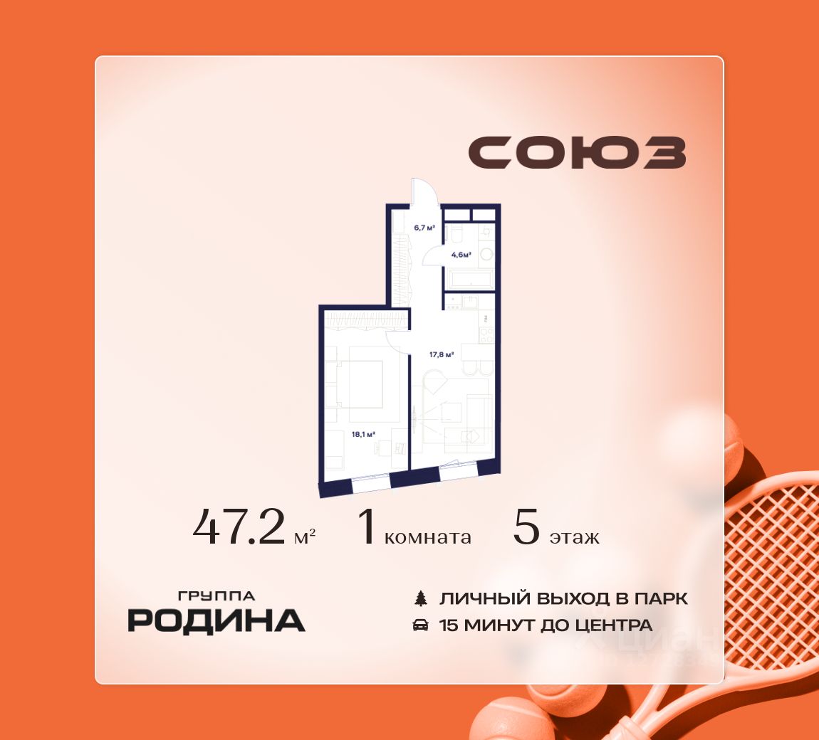 Продаётся 1-комнатная квартира площадью 47.2 м² на 5 этаже в Жилом Комплексе "Союз".