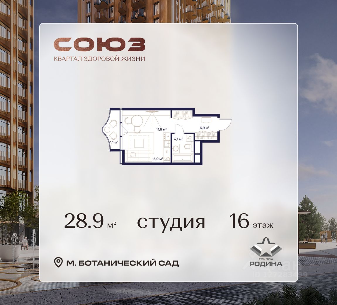 Продаётся квартира-студия площадью 28.9 м² на 16 этаже в Жилом Комплексе "Союз".