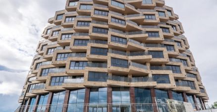 • Современный фасад с угловыми террасами и стильными балконами.