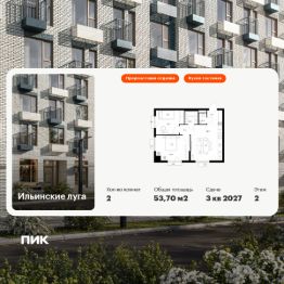 Продаётся 2-комн. квартира площадью 53,7 кв.м на 2 этаже 9 этажного дома (Корпус 3.1, Секция 1) проекта ПИК Ильинские луга. Светлый просторный подъезд на уровне земли, функциональная планировка, большие окна, предчистовая отделка.