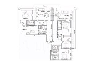 Апартамент без отделки с возможностью разместить: просторную гостиную с зонами столовой и кухни, 5-6 спален, 5 санузлов, гардеробные, постирочную и дополнительные хозяйственные помещения. Терраса по периметру апартамента.