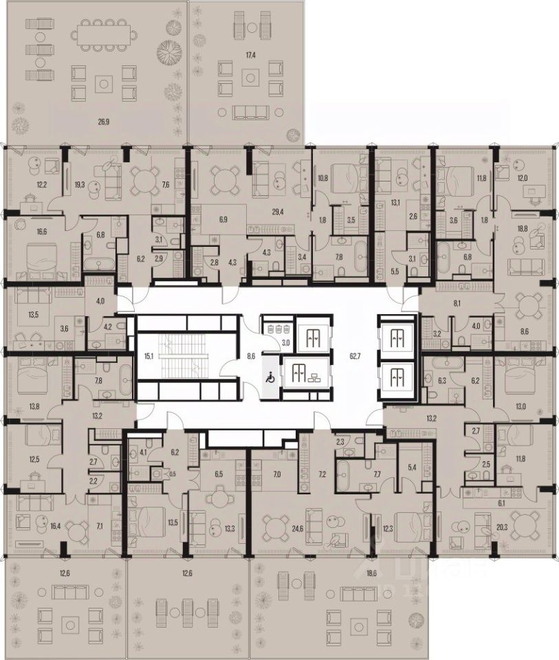 • Двухуровневый двор-парк 2 га с хвойным лесом и террасами