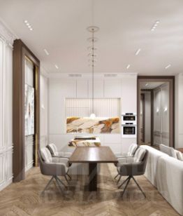 В квартире большая кухня-гостиная 39 м2 с дорогой кухней из шпона и эмали, сделанной под заказ именно для этой квартиры. Кухня полностью укомплектована техникой Bosch.