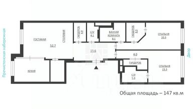 Вариант возможной планировки: Кухня-столовая, гостиная, Две спальни со своими гардеробными и ванными комнатами, постирочная, гостевой санузел. По видам расположена на две стороны света. Окна кухни и гостиной выходят на набережную, спальни выходят во внутренний красивый двор с красивым ландшафтом.