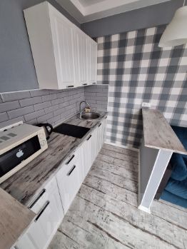 В апартаментах выполнен дизайнерский ремонт, который подчеркивает современность и стиль. Компактная кухня площадью 3 кв. м оснащена всем необходимым для комфортного приготовления пищи. Санузел совмещенный, выполнен в современном стиле. Пространство продумано до мелочей, чтобы обеспечить комфорт и уют.