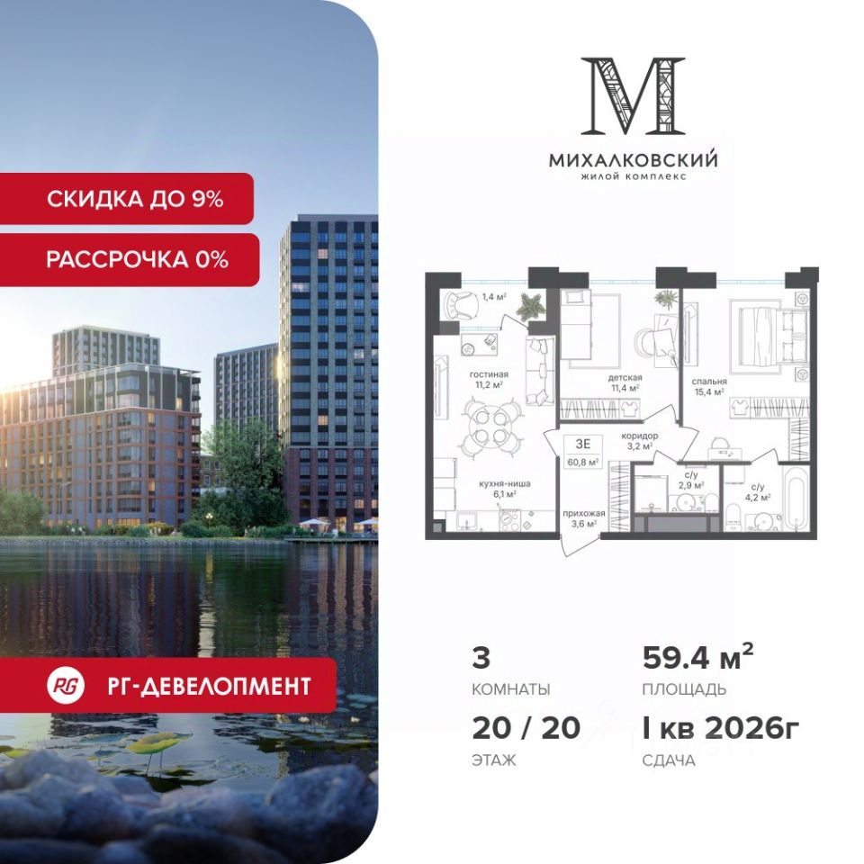 Продаётся 3-к квартира 59,4 кв.м. в ЖК "Михалковский" на 20-м этаже 20 этажного дома.