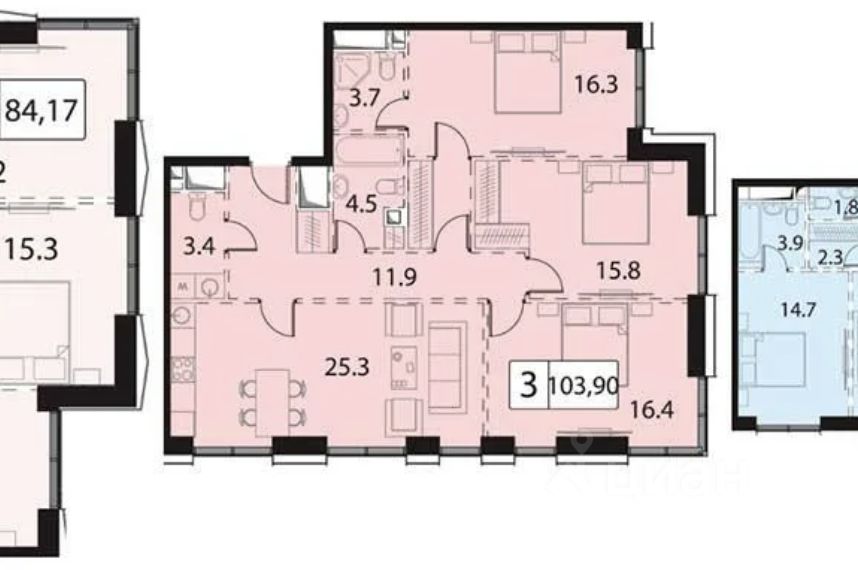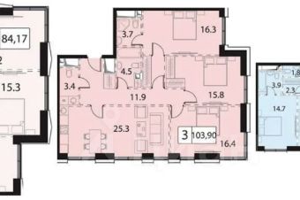 О квартире: 3 спальни, просторная кухня-гостинная, 2 совмещенных и 1 раздельный с/у. Без ремонта.