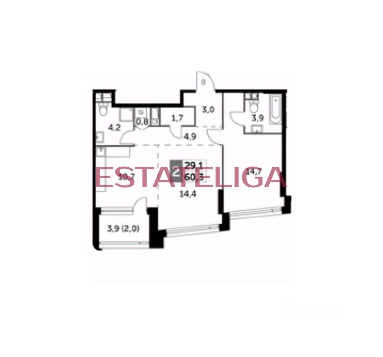 Продаётся 2-к квартира, общей площадью 60,3 кв.м. на 14-м этаже 29-этажного дома