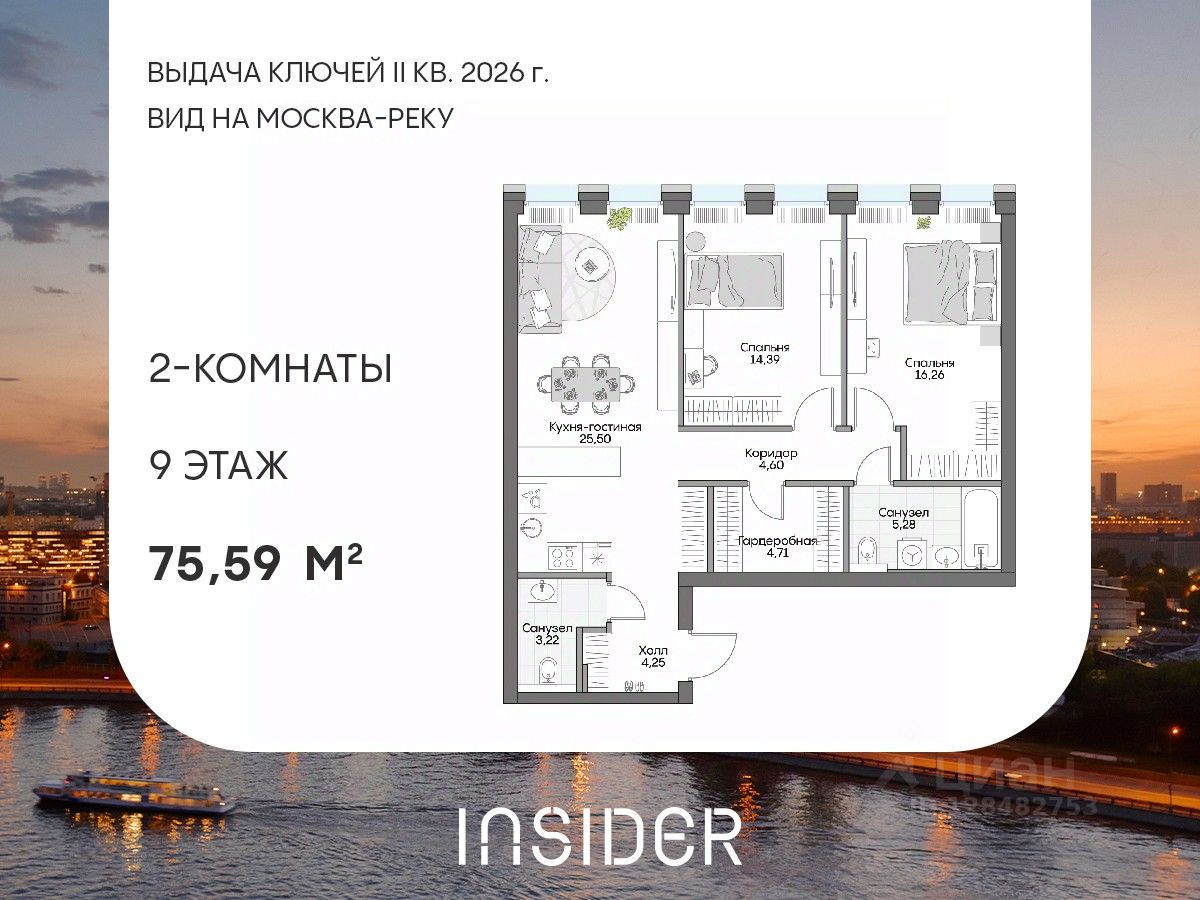 Просторный лот c 2-мя спальнями в Доме на набережной INSIDER. Сервисные лоты с системой "умный дом" на первой линии Москвы-реки.