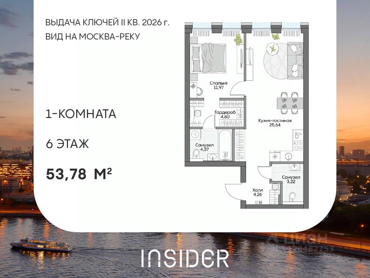 Просторный лот с 1 спальней в Доме на набережной INSIDER. Сервисные лоты с системой "умный дом" на первой линии Москвы-реки.
